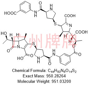 CAS No:N/A||Chemical Formula:C44H50N6O14S2||Molecular Weight:951.03200||Exact Mass:950.28264||(4R,5S,6S)-3-(((3S,5S)-5-((3-((((2R)-1-carboxy-1-((2S,3R)-5-carboxy-4-(((3S,5S)-5-((3-carboxyphenyl)carbamoyl)pyrrolidin-3-yl)thio)-3-methyl-3,4-dihydro-2H-pyrrol-2-yl)propan-2-yl)oxy)carbonyl)phenyl)carbamoyl)pyrrolidin-3-yl)thio)-6-((R)-1-hydroxyethyl)-4-methyl-7-oxo-1-azabicyclo[3.2.0]hept-2-ene-2-carboxylic acid