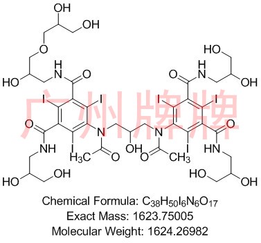 CAS No:N/A||Chemical Formula:C38H50I6N6O17||5-[acetyl[3-[acetyl[3,5-bis[(2,3-dihydroxypropyl)carbamoyl]-2,4,6-triiodophenyl]amino]-2-hydroxypropyl]amino]-N-[3-(2,3-dihydroxypropoxy)-2-hydroxypropyl]-N′-(2,3-dihydroxypropyl)-2,4,6-triiodobenzene-1,3-dicarboxamide