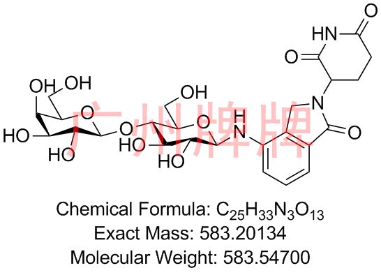 CAS NO:N/A| Chemical Formula: C25H33N3O13|Molecular Weight: 583.54700|Exact Mass: 583.20134|3-(4-{[(2R,3S,5S)-5-{[(2S,4S,5S)-3,4,5-trihydroxy-6-(hydroxymethyl)-3,4,5,6-tetrahydro-2H-pyran-2-yl]oxy}-3,4-dihydroxy-6-(hydroxymethyl)-3,4,5,6-tetrahydro-2H-pyran-2-yl]amino}-1-oxo-2,3-dihydro-1H-isoindol-2-yl)hexahydropyridine-2,6-dione