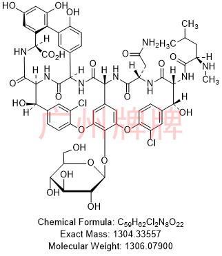 CAS NO:101485-50-1|Chemical Formula:C59H62Cl2N8O22 |Molecular Weight:1306.07900|Exact Mass: 1304.33557|O4.4-de-[2-O-(3-amino-2,3,6-trideoxy-3-C-methyl-α-L-lyxo-hexopyranosyl)-β-D-glucopyranosyl]-O4.4-β-D-glucopyranosyl-vancomycin B (desvancosaminylvancomycin B)