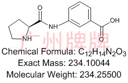 CAS No:N/A||Chemical Formula:C12H14N2O4||Molecular Weight:250.25400||Exact Mass:250.09536"||3-((2S,4S)-4-hydroxypyrrolidine-2-carboxamido)benzoic acid