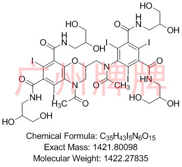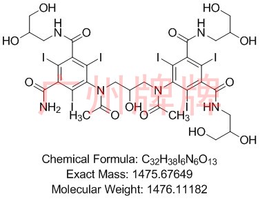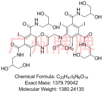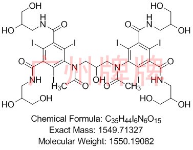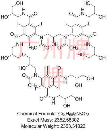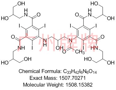 CAS No:N/A||Chemical Formula:C38H50I6N6O17||5-[acetyl[3-[acetyl[3,5-bis[(2,3-dihydroxypropyl)carbamoyl]-2,4,6-triiodophenyl]amino]-2-hydroxypropyl]amino]-N-[3-(……